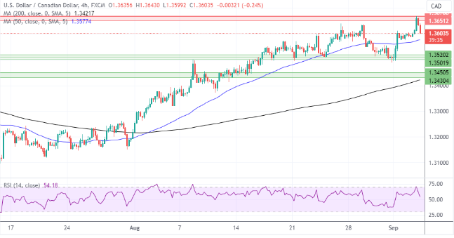 如果美元兑加元回落在50均线下方的1.3575,它将朝着最近的支撑位1.3500 – 1.3520前进。