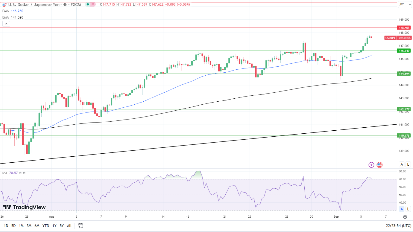14-4小时RSI读数为67.10,表明美元/日元在进入超卖区域之前还有触及148的空间。