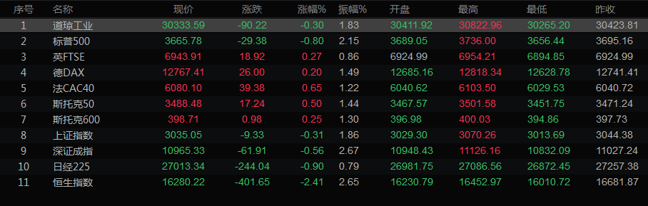 美股收盘情况: 道琼斯工业平均指数下跌0.3%,至30333.59点;