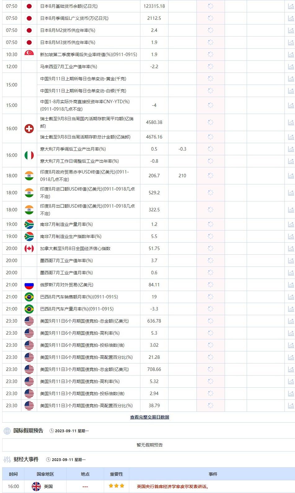 汇通财经APP讯——9月11日,投资者需要关注的重点数据:日本8月M2货币供应年率,日本8月M3货币供应年率,加拿大截至9月8日全国经济信心指数。需要关注的大事件包括英国央行首席经济学家皮尔发表讲话。