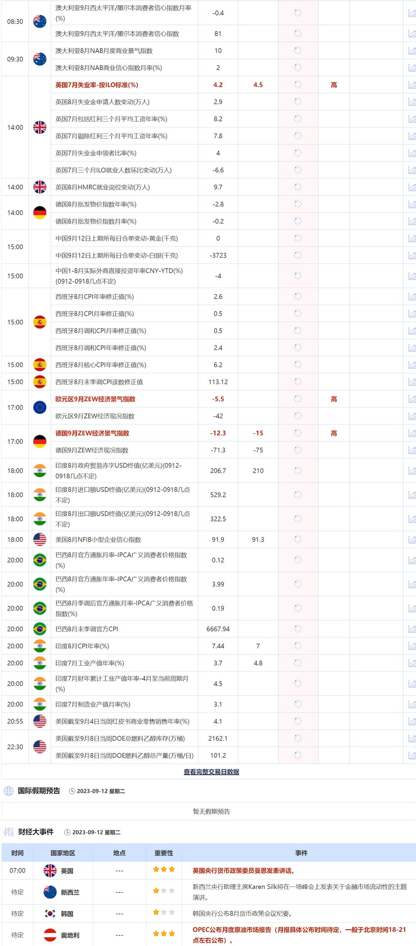 14:00 英国7月失业率-按ILO标准(%) , 前值 4.2 , 预期值 4.5 , 公布值:待发布14:00 英国8月失业金申请人数变动(万人) , 前值 2.9 , 预期值 -- , 公布值:待发布