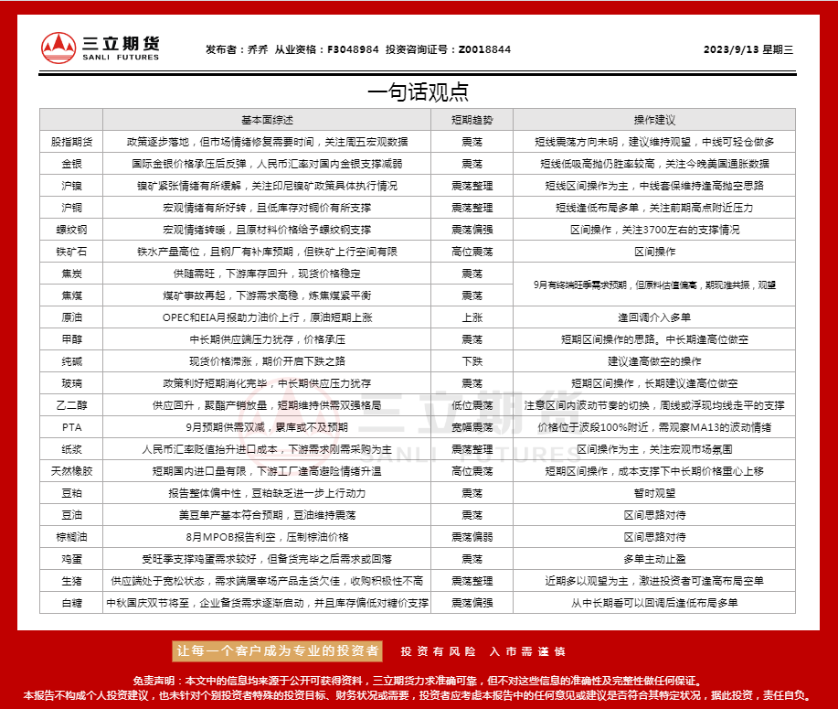 标题:三立期货9月13日沪金、沪银、原油、有色金属等期货操作建议