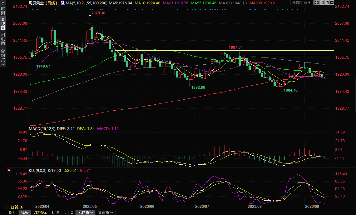 现货黄金价格高开低走,但终因支撑力不足,未能持续涨势,最终以1913.35美元/盎司的价格收盘,下跌8.91美元/盎司或为0.46%。