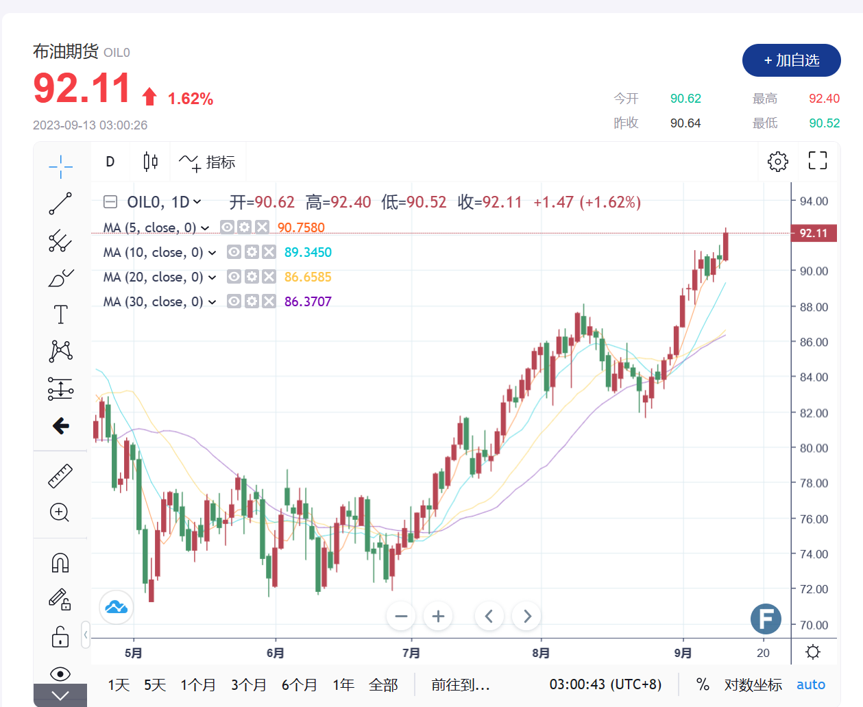WTI原油价格攀升至10个月高点,目前每桶价格为88.49美元美元/桶,受到石油出口国的供应削减和政治因素的支撑。