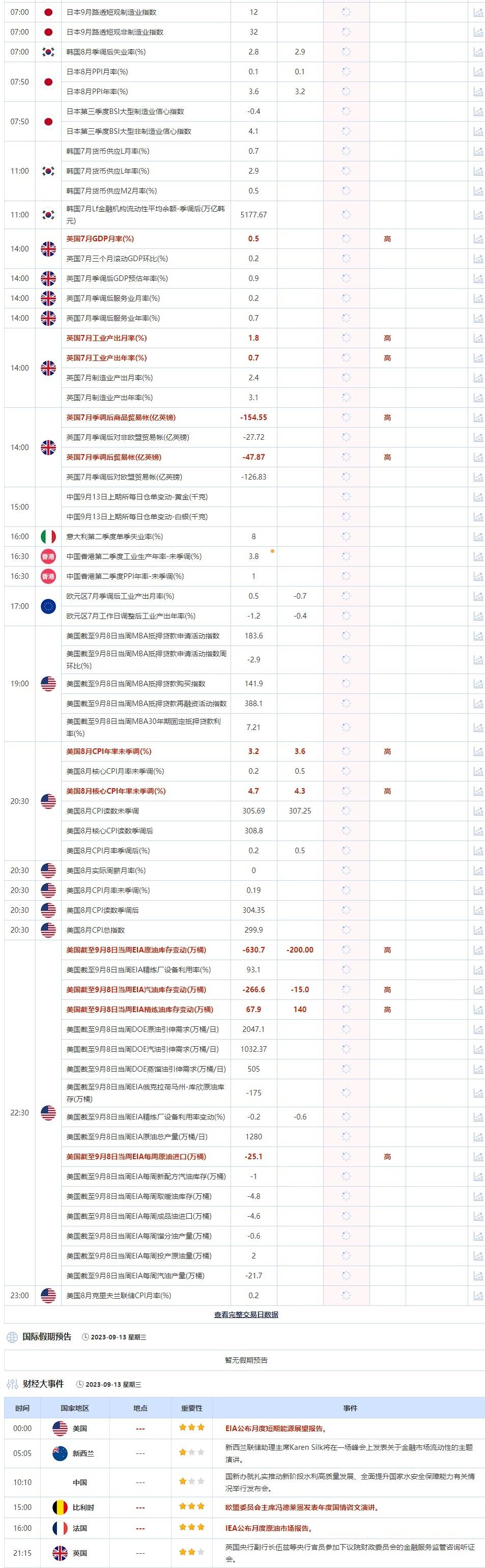20:30 美国8月核心CPI年率未季调(%) , 前值 4.7 , 预期值 4.3 , 公布值:待发布20:30 美国8月CPI读数未季调 , 前值 305.69 , 预期值 307.25 , 公布值:待发布