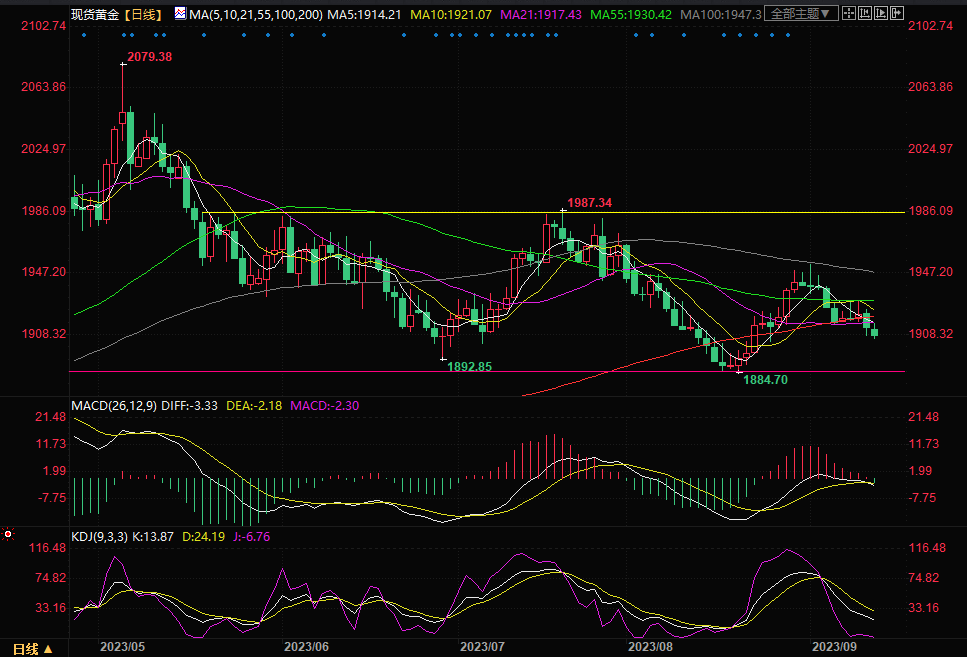 COMEX 10月黄金期货收跌0.15%,报1914.4美元/盎司。COMEX 12月黄金期货收跌0.13%,报1932.5美元/盎司。
