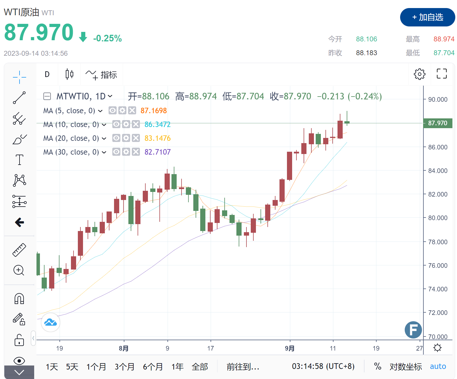 截至周三收盘,美国WTI原油期货上涨0.08%,收报88.83美元/桶;