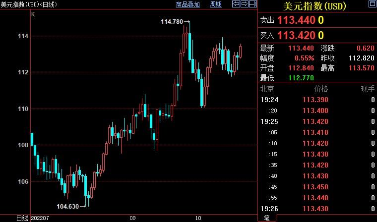 美元指数上涨上涨0.18%至113.486。人们普遍预计美联储将在11月份政策会议上连续第四次激进加息75个基点,并且美联储12月份将再次大幅加息。