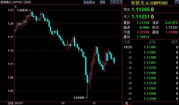 英镑兑美元下跌0.65%至1.1104,盘中高见1.1439。上任仅45天的英国首相特拉斯周四(10月20日)发表辞职声明。在政府财政政策180度大转弯和政局持续不稳定之际,市场预计英国央行加息力度会减弱,对英镑缺乏看涨信念。