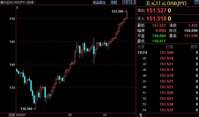 美元兑日元升破150,创1990年8月以来新高,周线十连阴。在全球其他主要央行不同程度大幅加息的情况下,日本央行坚持实施多年的超宽松货币政策不动摇,对日元陷入穷途末路负有责任。