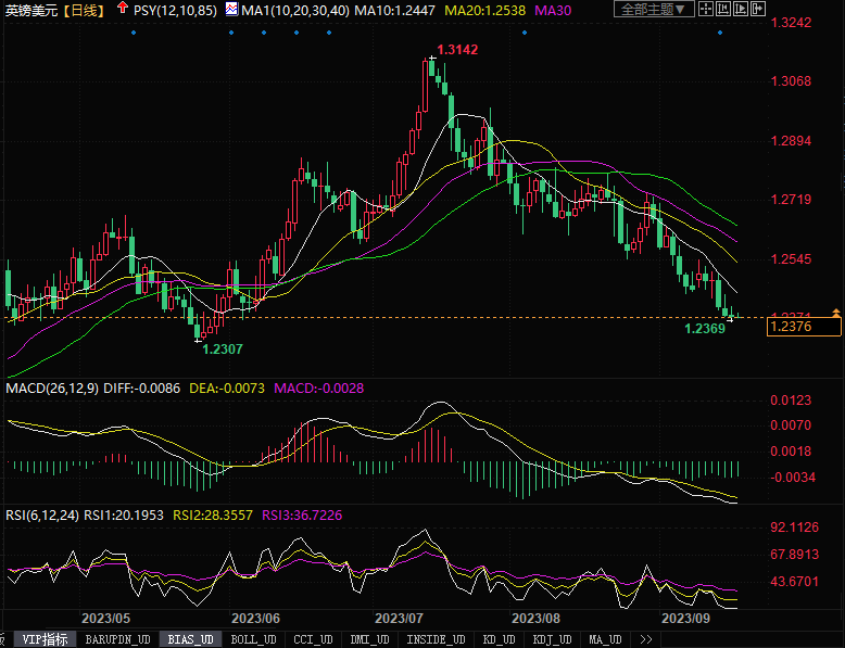 收盘价与周五持平在1.2385,日内最低曾触及1.2371美元。周一交易清淡,市场波幅不大。交易员们周一正在等待本周晚些时候可能撼动汇市的几项央行利率决定。交易员认为,英国央行周四将上调利率25个基点至5.5%,这可能是本轮紧缩周期的最后一次加息。因英国劳动力市场和经济以及欧元区经济放缓,已不允许英央行继续有太大空间提升利率了。而反观美国,由于其经济表现优于全球大部分国家,从而趋势交易员有非常强烈的共识,认为可能从利率点阵图中能看到美联储一些鹰派立场。也就是说在英镑与美元利率即便持平的情形下,考虑到美国经济的良好表现,美元的吸引力都将会盖过英镑。日线图上,镑美继续沿布林带通道下轨线下行,短线也显现不出一丝反弹整理的欲求。恐怕英镑/美元逃不脱逢高被沽售的交易节奏。