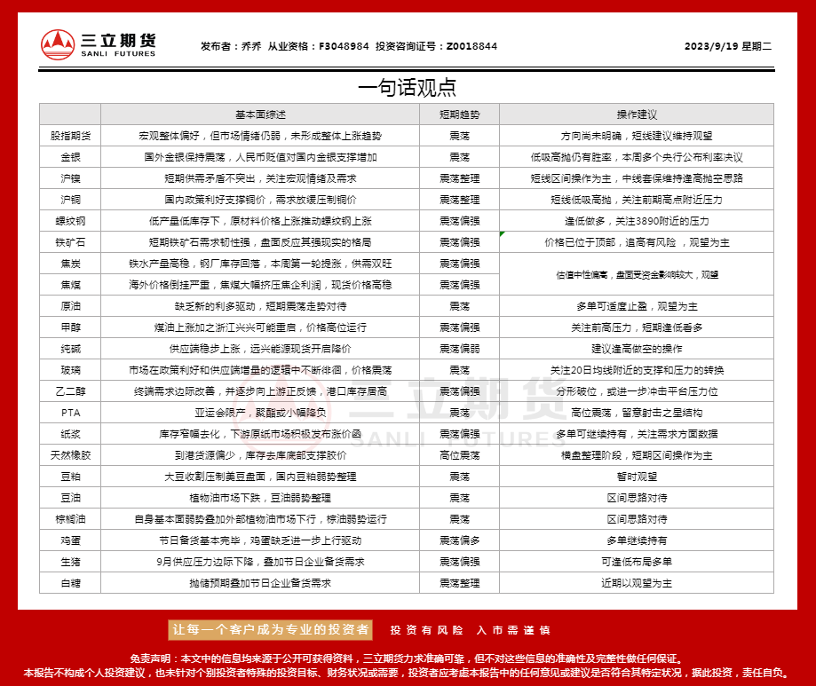 标题:三立期货9月19日沪金、沪银、原油、有色金属等期货操作建议