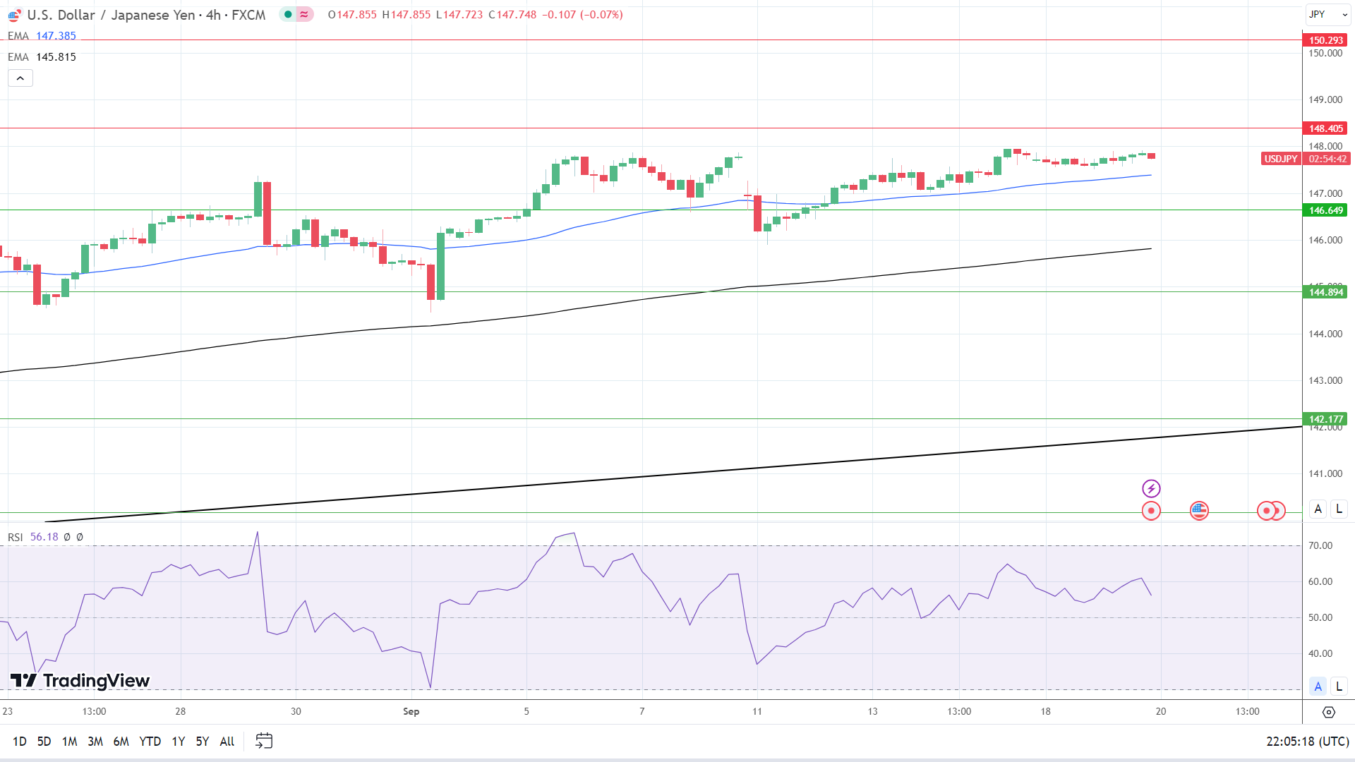 14-4小时RSI读数为56.18,支持美元/日元突破148.405阻力位,然后进入超买区域。