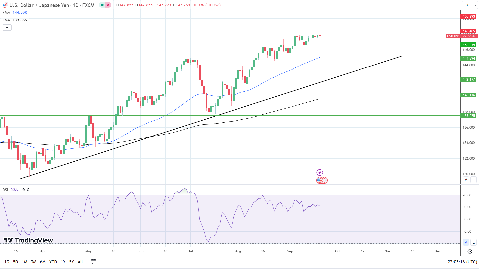 60.95的14日RSI支持美元/日元突破148.405阻力位,然后进入超买区域。