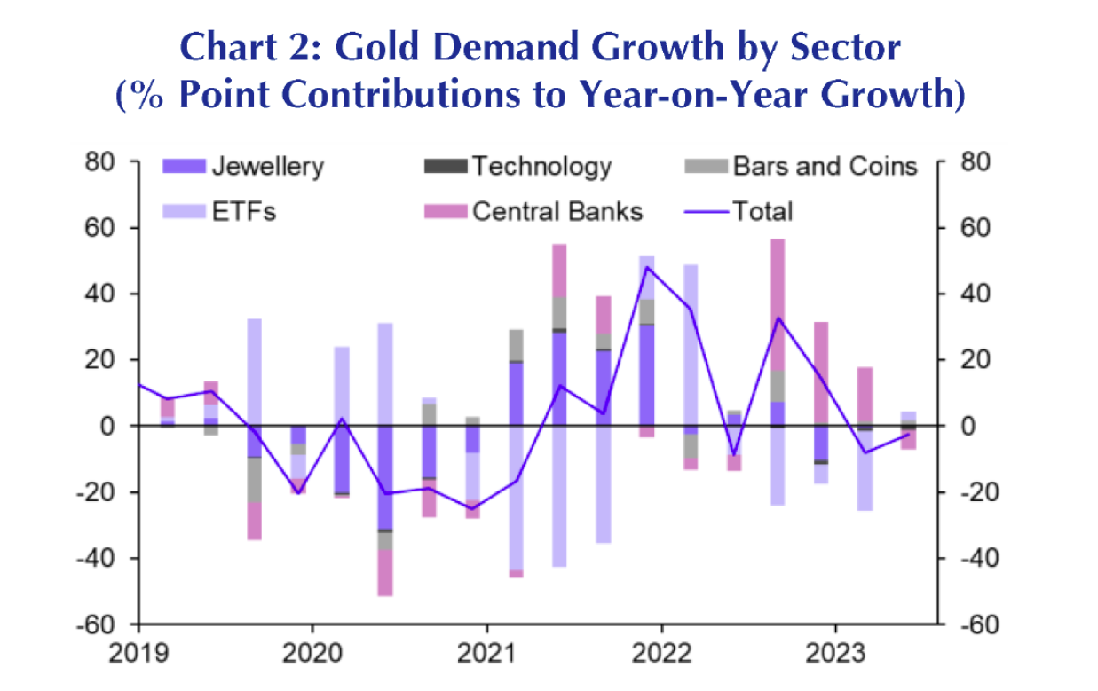 分析师在最近的一份报告中表示:“由于担忧美国和欧洲银行的稳定性而引发的避险需求(导致今年3月至5月期间黄金价格上涨至2000美元/盎司左右)之后,黄金价格一直在下降。” 他们还指出:“根据世界金协会的数据,今年上半年全球对黄金的需求同比下降约5%,主要是由于通过交易所交易基金的投资者需求减少,而黄金供应略有增加。”
