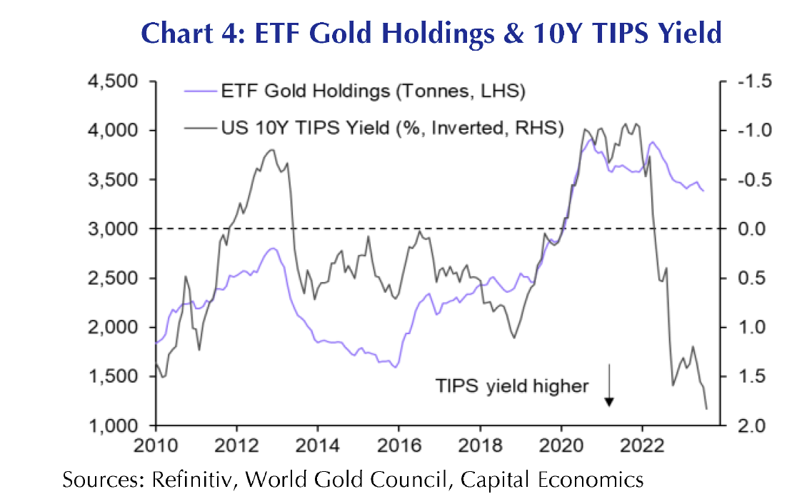 Capital Economics预测,对贵金属的需求将进一步下降,“原因是投资者对黄金作为对严重经济衰退和高通胀的避险工具的需求减少”,他们表示:“这是因为我们预计美国经济在第四季度将仅出现轻微的收缩,然后在明年恢复增长。” 他们还预测,到2024年中期,美国的通胀将接近美联储的2%目标。