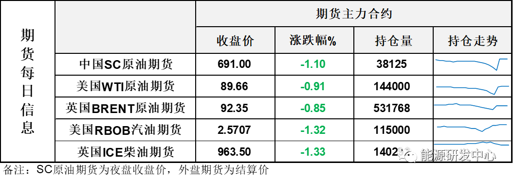 【1】WTI主力原油期货收跌0.82美元,跌幅0.91%,报89.66美元/桶;布伦特主力原油期货收跌0.79美元,跌幅0.85%,报92.35美元/桶;INE原油期货收跌1.1%,报691元。