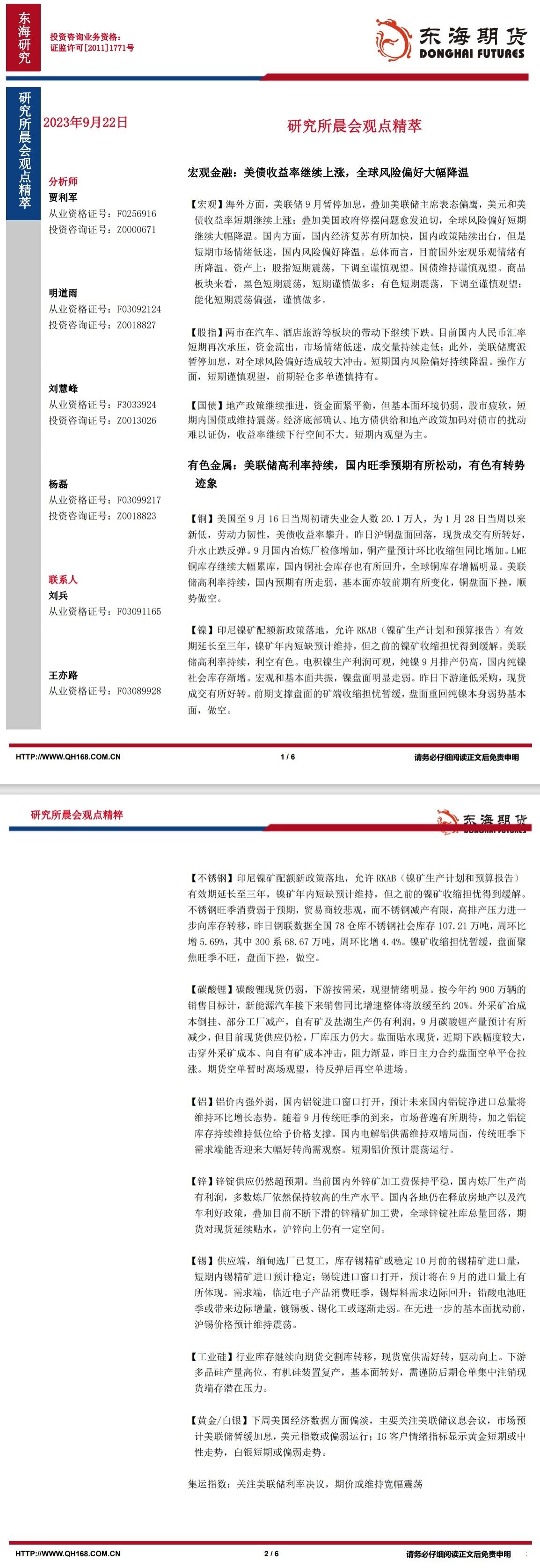 标题:【东海期货9月22日研究所晨会观点精萃】美债收益率继续上涨,全球风险偏好大幅降温