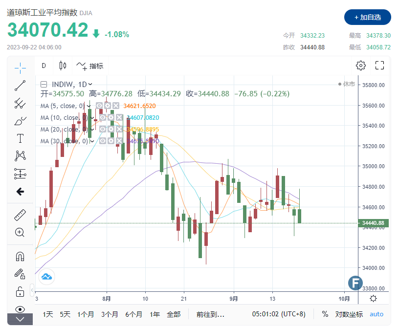 道琼斯工业平均指数下跌370.46点,跌幅1.08%,收于34,070.42点。标准普尔500指数下跌1.64%,至4,330点。纳斯达克综合指数下跌1.82%,至13,223.98点。