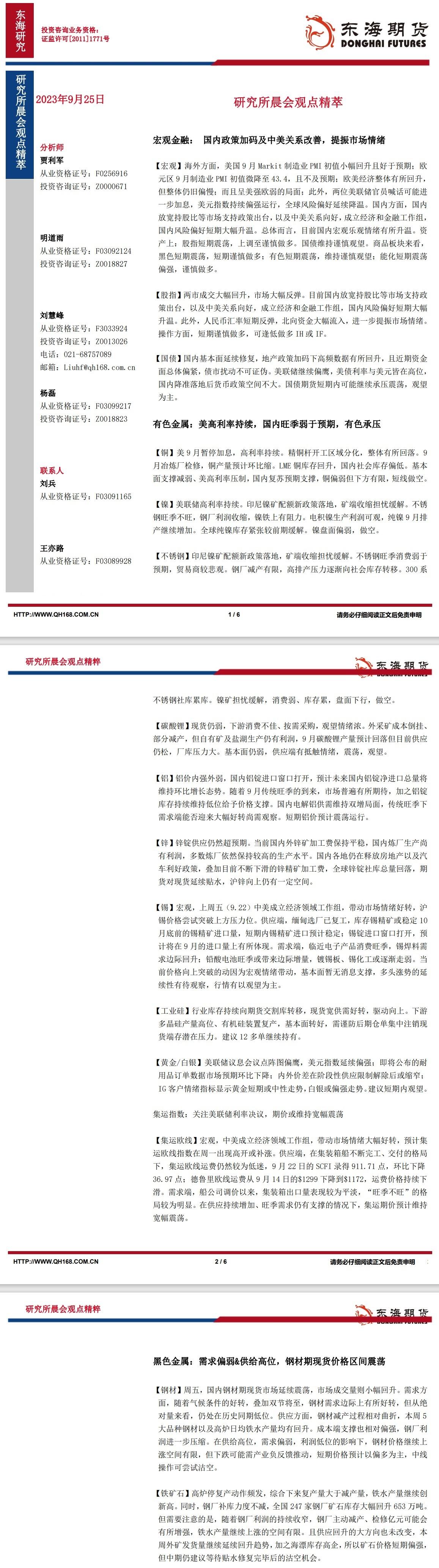 标题:【东海期货9月25日研究所晨会观点精萃】国内政策加码及中美关系改善,提振市场情绪