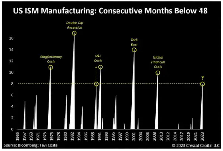 在最近的一份报告中,Jon Wolfenbarger分享了两个证据,表明经济衰退可能即将来临。一是美国供应管理协会的采购经理指数继续显示出经济增长放缓的迹象。当该指数读数低于50时,制造业活动被视为正在收缩。尽管服务业对美国经济的贡献更大,但制造业指数已经连续八个月低于48,这一持续时间开始接近其他衰退时期的水平。