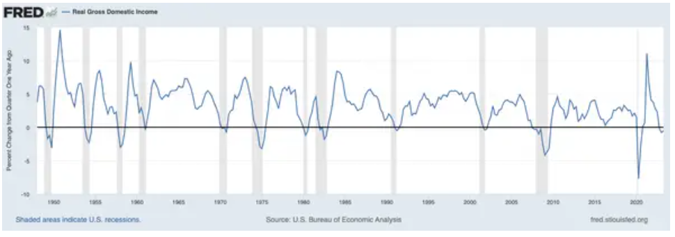 Jon Wolfenbarger表示:“在经济不陷入衰退的情况下,实际GDI从未连续三个季度下降。”他补充说,即使GDP同期为正增长,这种情况也可能发生,而且GDP可能会晚于GDI变为负值。美国GDP目前已经连续三个季度为正值。