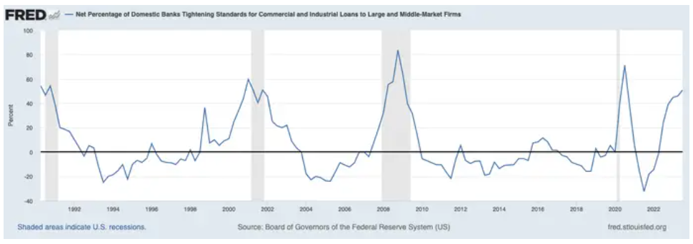 第三是收紧贷款标准。当银行担心消费者和企业偿还贷款的能力时,它们会收紧放贷标准。这反过来又减缓了支出和业务扩张,损害了经济增长。
