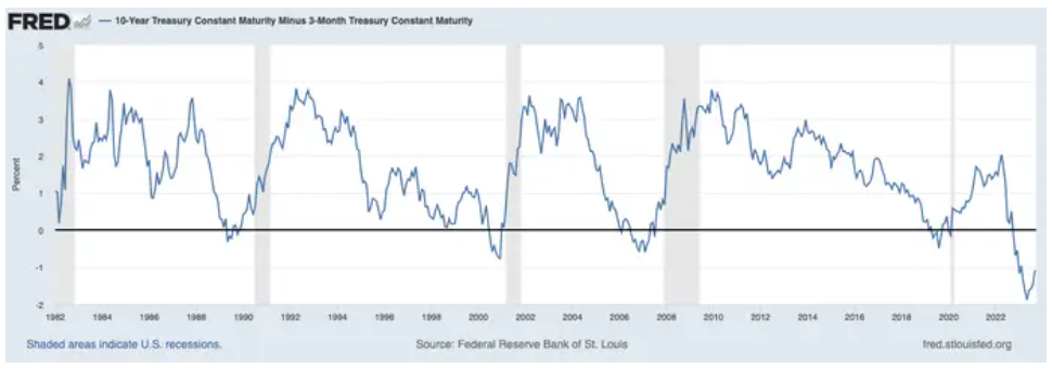 最受广泛关注的曲线之一是国债收益率曲线。目前,3个月期等较短期限的收益率高于10年期等较长期限的收益率。像这样的倒挂在过去几十年的历次经济衰退中都有完美的记录,它们的发生在很大程度上是由于美联储更严厉的紧缩周期,而这种周期往往以经济低迷告终。