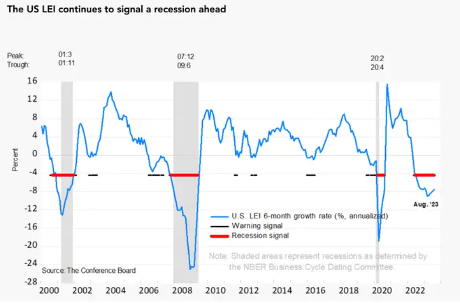 另一个指标是世界大型企业联合会的领先经济指数,它是制造业活动、房地产市场活动、股票表现和消费者预期等综合指标。它在预示经济衰退即将到来方面也具有完美的命中率,并且目前正处于低迷区域。