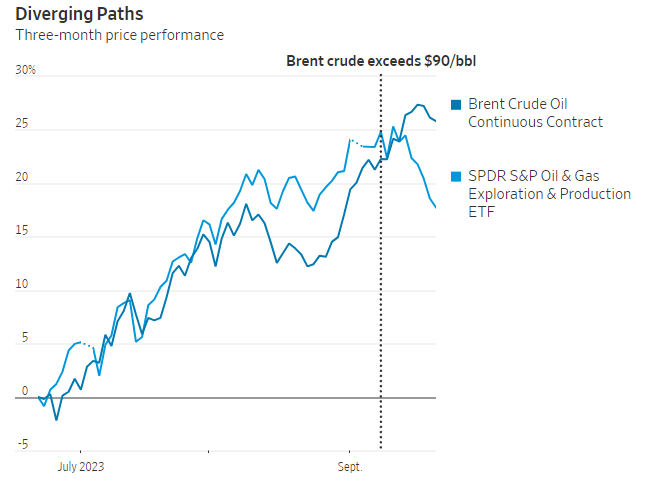尽管过去一年石油和天然气生产商的股价大多与石油价格同步波动,但这种关系显然已经破裂。自9月8日以来,自9月8日布伦特原油收于每桶90美元以上以来,油价又上涨了2.6%,而石油生产商指数则下跌了5.3%。该指数的回落可能是自2021年以来快速增长后的一次自然调整,但对于能源投资者来说,不投入过多的资金可能更为明智,因为市场条件可能已经发生变化。