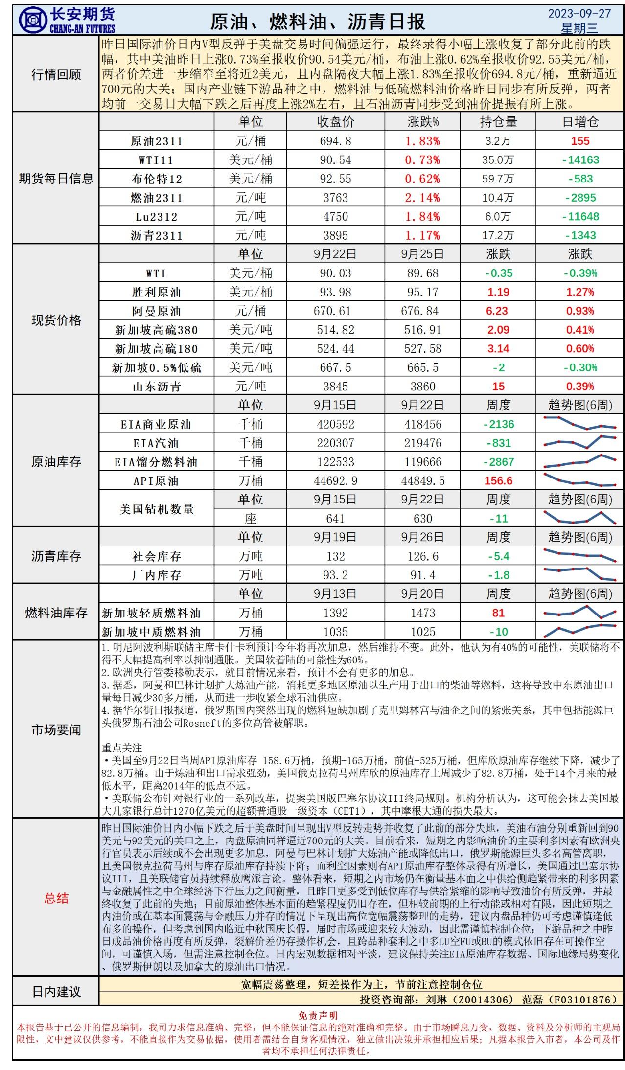标题:长安期货9月27日原油早评:低位库存助力油价V型反弹,节前注意控制仓位