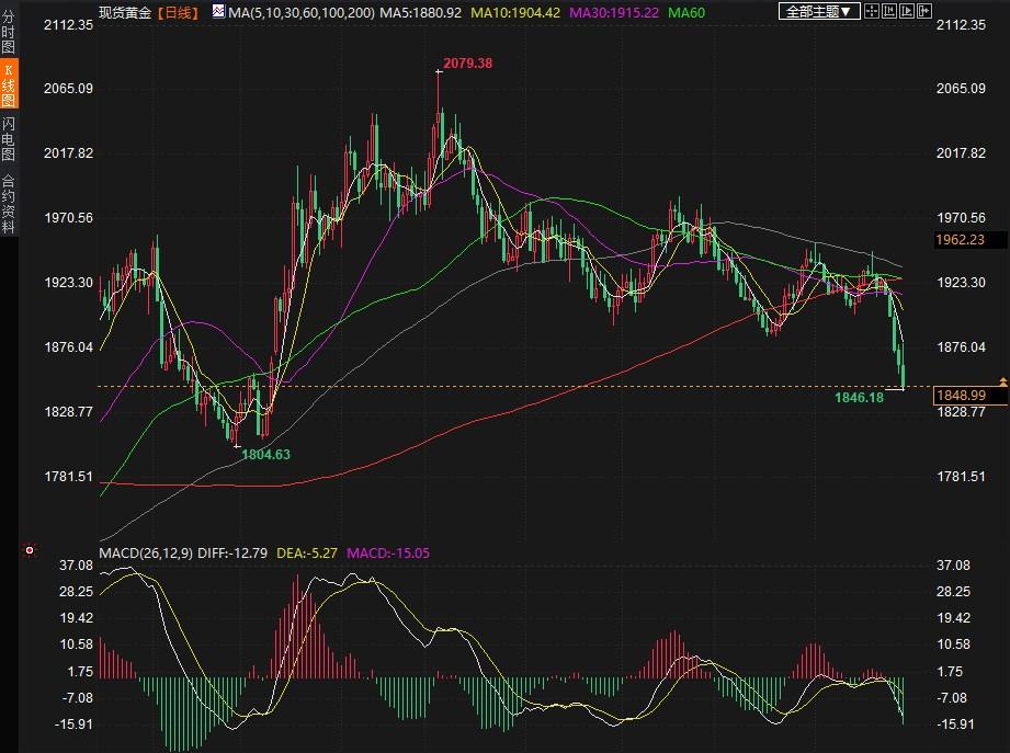 现货黄金价格继续本周跌势,收报1848.69美元/ 盎司,跌幅0.85%。