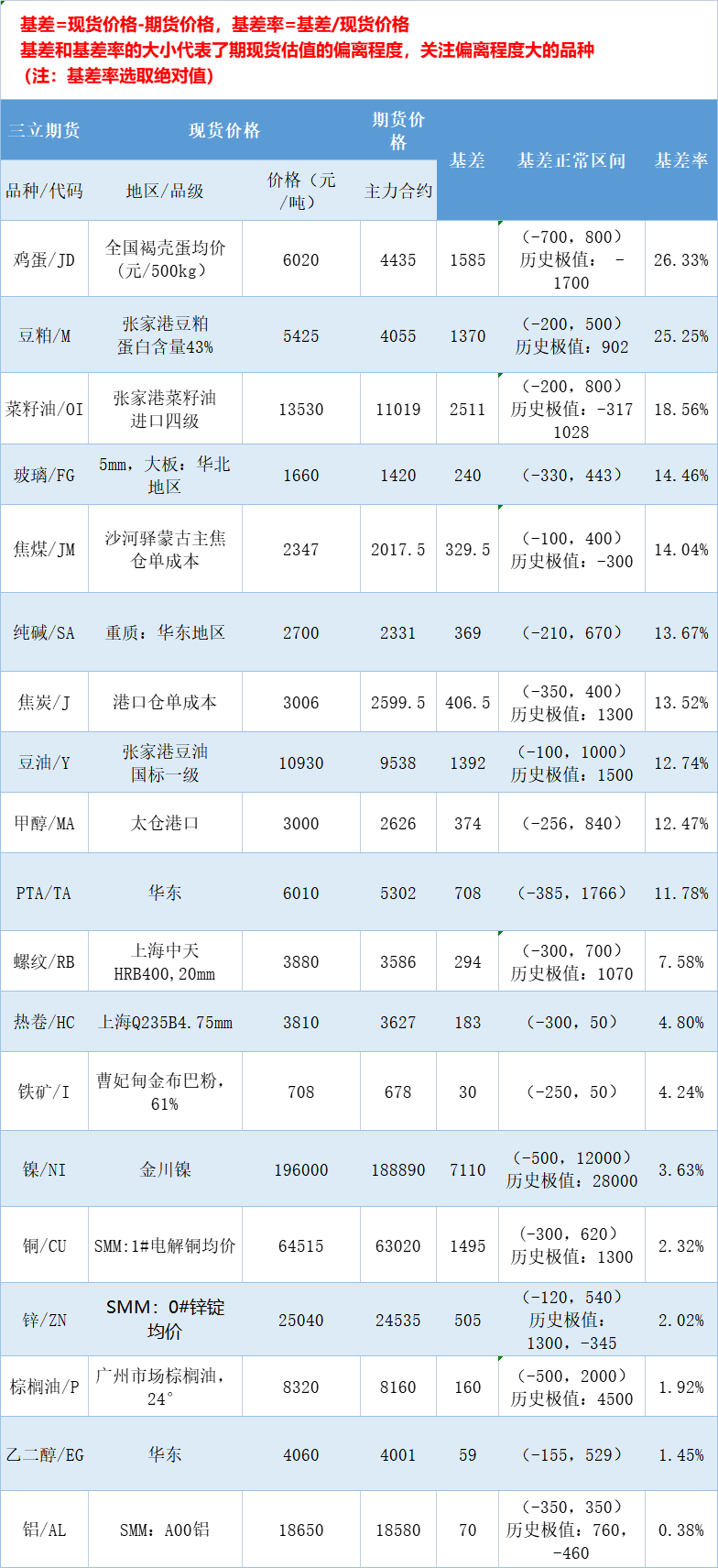 三立期货10月25日基差:一张图尽览有色金属、黑色系、能源化工和农产品基差(按基差率从大到小排序)