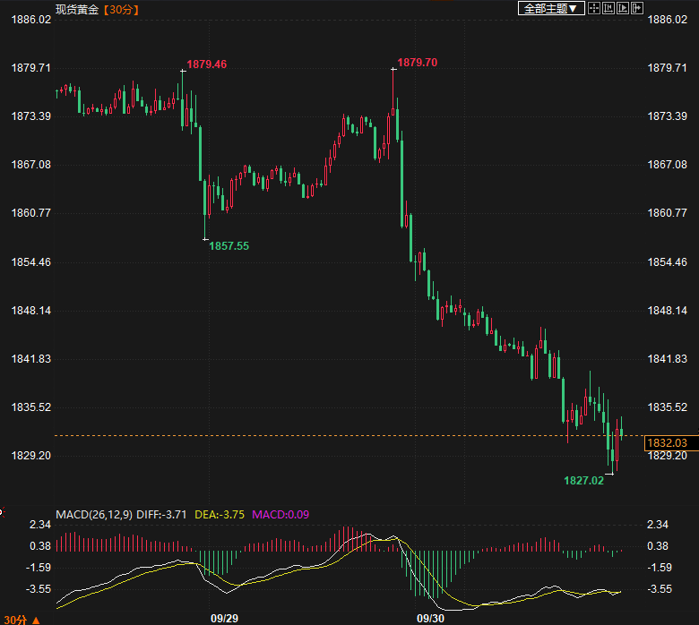 现货黄金回落至1830美元/盎司下方,现报1828.48美元/盎司,创3月10日以来新低。