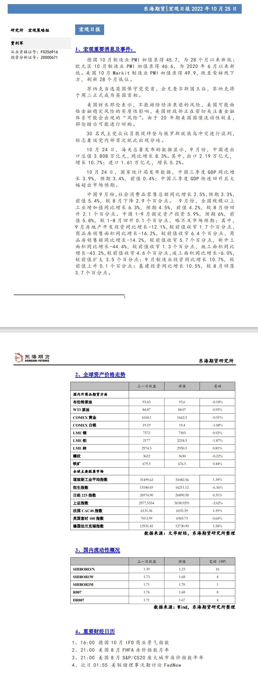 标题:【东海期货10月25日宏观日报】:国内9月经济不及预期,股市和汇率大跌