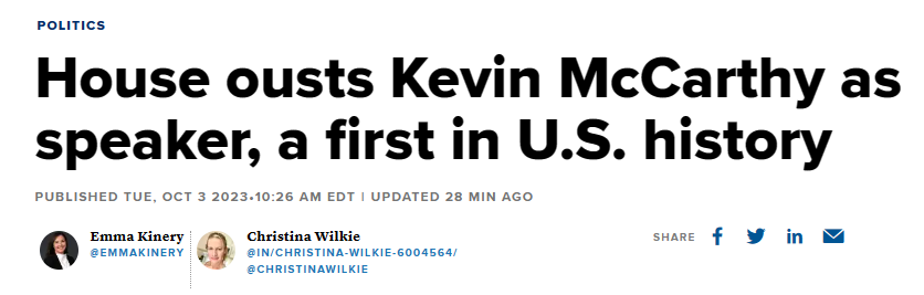周二(10月3日),美国众议院罢免了共和党人麦卡锡(Kevin McCarthy)的议长职务,麦卡锡成为美国历史上首位被罢免的众议院议长。