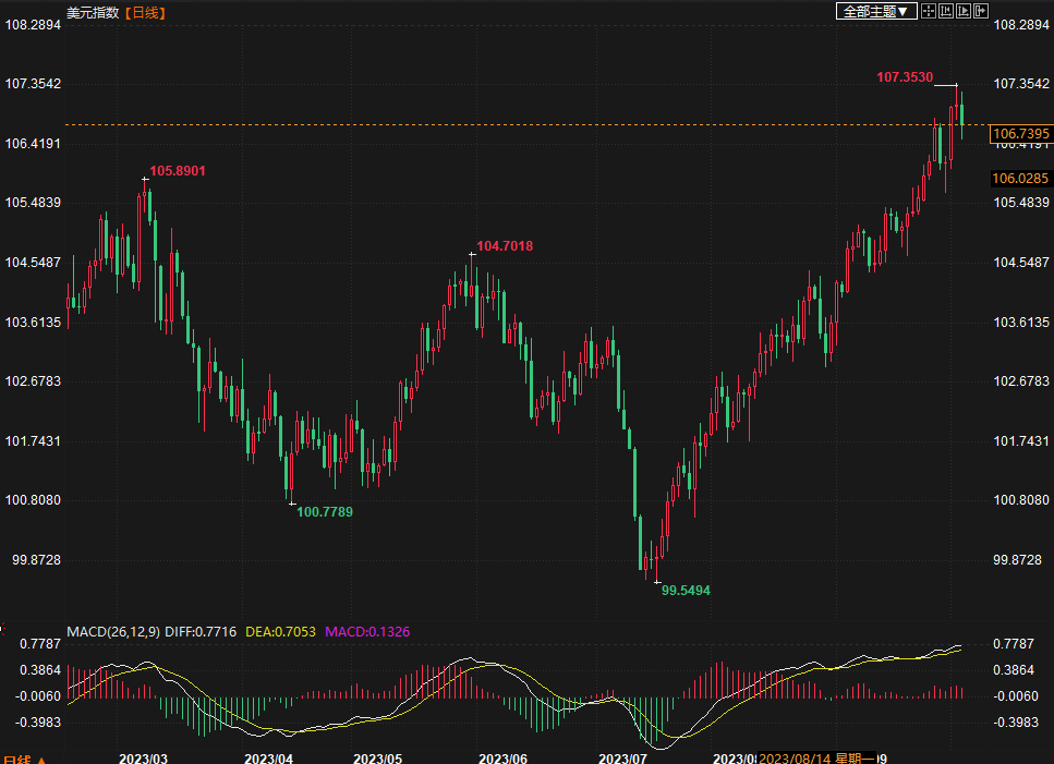 汇通财经APP讯——美元指数:美指周二上涨在107.35之下遇阻,下跌在106.80之上受到支持,意味着美元短线下跌后有可能保持上涨的走势。如果美指今天下跌在106.75之上受到支持,后市上涨的目标将会指向107.30--107.60之间。今天美指短线阻力在107.25--107.30,短线重要阻力在107.55--107.60。今天美指短线支持在106.75--106.80,短线重要支持在106.50--106.55。