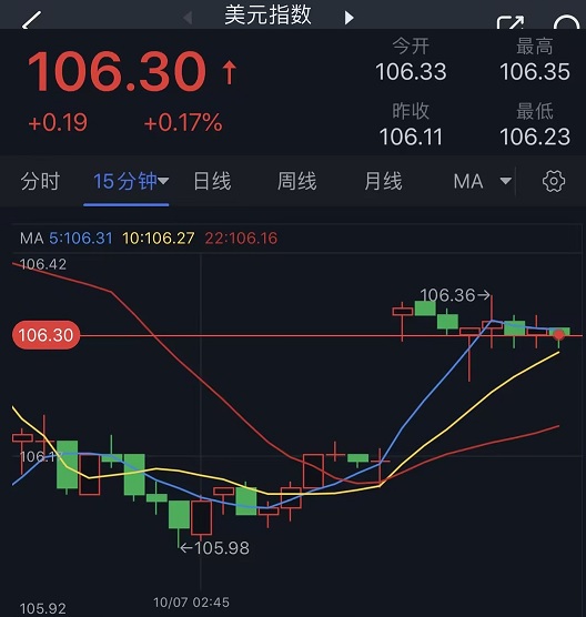 ICE美元指数开盘跳空高开,最高触及106.35。美元——在动荡时期被视为避风港——兑欧元和英镑上升至少0.2%,而澳元和纽元等风险货币则走弱。