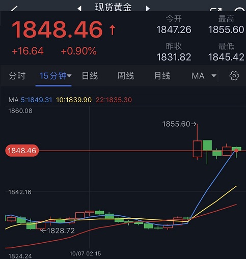 除了美元之外,另一避险资产也受益于巴以冲突。现货黄金周一开盘大幅跳空高开,金价最高触及1855.60美元/盎司。目前金价仍交投在1850美元/盎司附近。