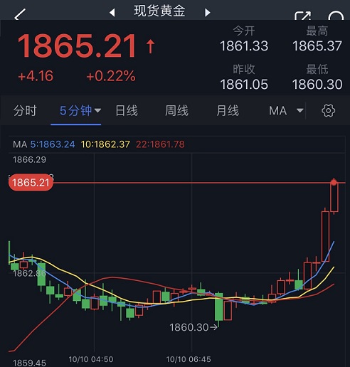 周一,金价创下5月以来最大涨幅,在哈马斯袭击以色列后紧张局势加剧后,避险需求增加,此外,美元指数自高位回落也利好金价。现货黄金周一收报1861.05美元/盎司,大幅上涨29.23美元或1.60%。