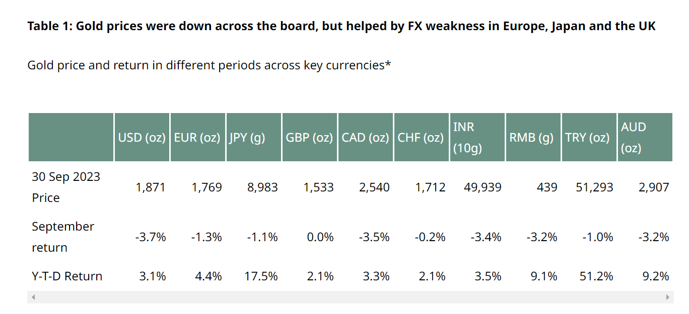 9 月份的大部分时间里,金价在 1,900 美元/盎司至 1,950 美元/盎司之间波动,直到 27 日大幅下跌,最终收于 1,871 美元/盎司,环比下跌 3.7%。本月强势美元导致欧元、日元和英镑环比小幅下跌。