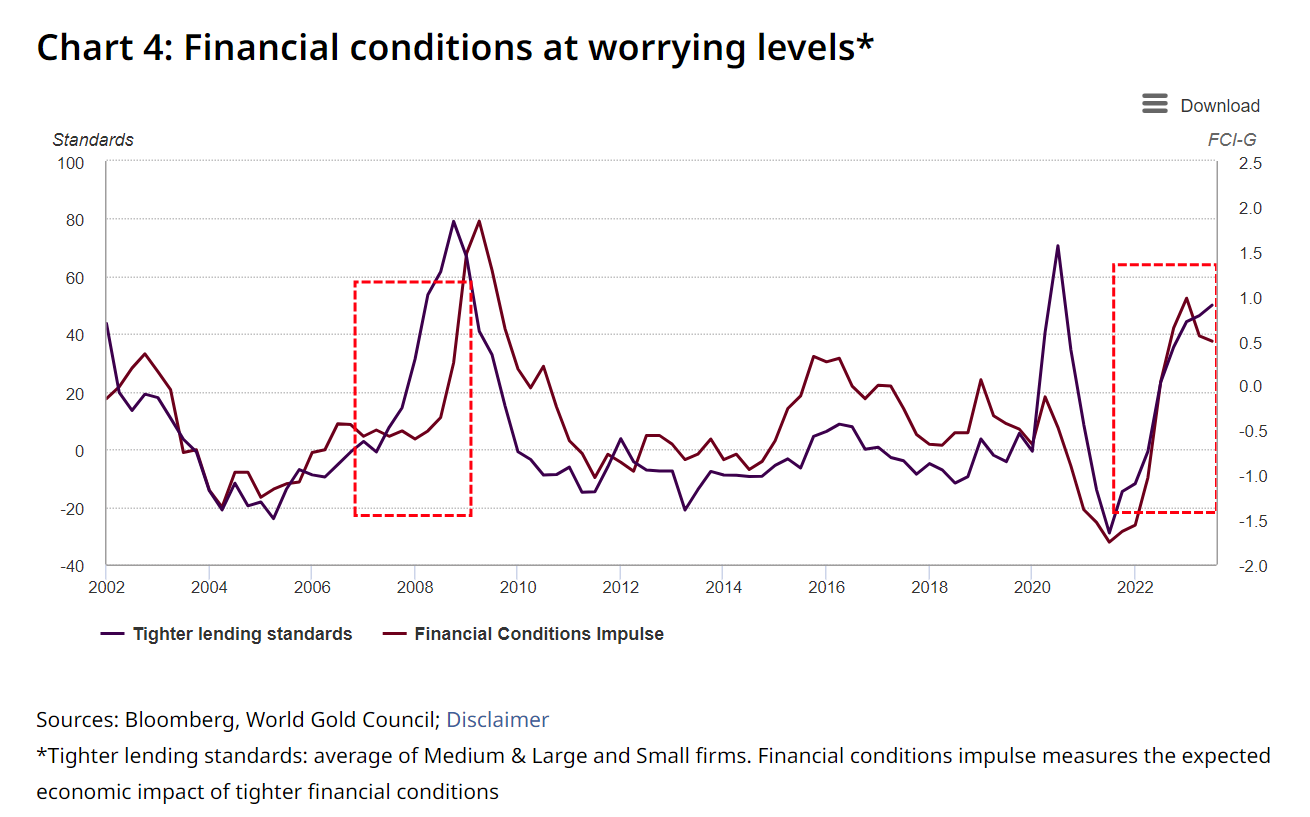 但黄金并不是债券收益率飙升的唯一受害者。较高的收益率正在压低股票风险溢价,而乐观的盈利增长预测让人想起 2007 年末的情况。收益率也进一步限制了金融状况,从某些指标来看,金融状况也与 2007 年类似。这反过来可能会加剧未来 6-12 个月的衰退风险。