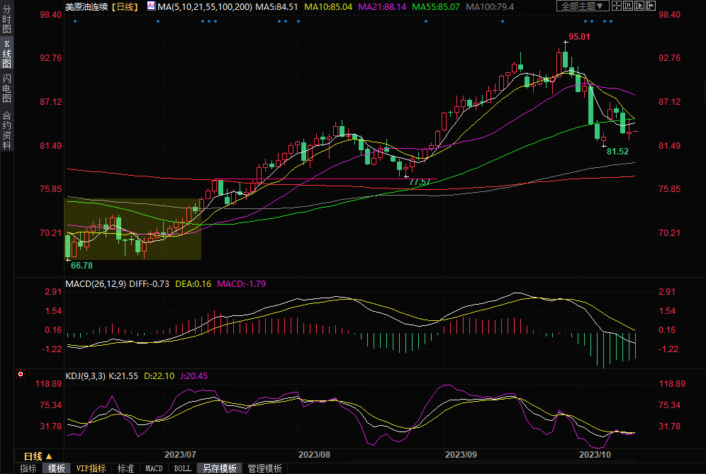 WTI 11月原油期货收跌0.58美元/桶,跌幅0.69%,收报82.91美元/桶。
