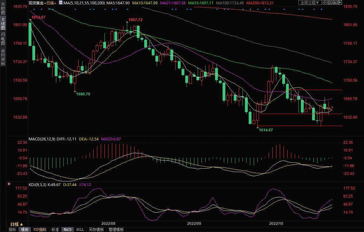 整体来看,目前关于美联储将放缓加息步伐的预期,是市场的关注焦点所在,本周这种预期有所升温,对金价和美债收益率打压明显,在短线给金价提供支撑,如果这种预期进一步升温,将给金价提供进一步反弹动能,上方关注1700整数关口附近阻力;但很显然,美联储放缓加息步伐还需要一段时间,短期而言,本周加拿大央行和欧洲央行、下周美联储和英国央行都将分别加息75个基点,持有黄金的机会成本仍将继续增加,令多头顾忌重重。市场观望情绪也比较浓,投资者需要从利率决议中寻找未来货币政策的进一步线索,这将加剧盘中多空来回拉锯博弈的频率。北京时间09:54,