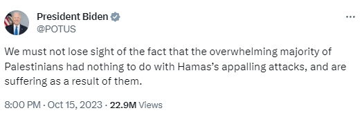 在外交方面,拜登团队对以色列24小时撤离的要求表示焦虑,欧盟和联合国称这一最后期限不切实际。周五,拜登表示,人们不应该“忽视绝大多数巴勒斯坦人与哈马斯无关的事实”,这是拜登周日早上在推特上发布的。