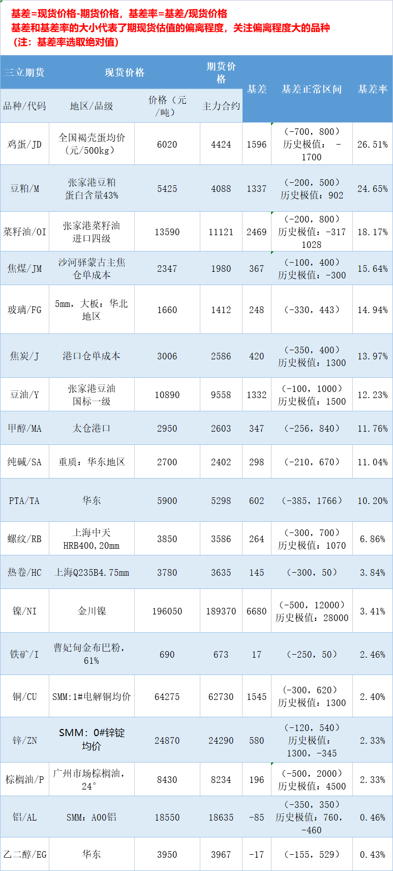 标题:三立期货10月26日基差:一张图尽览有色金属、黑色系、能源化工和农产品基差(按基差率从大到小排序)