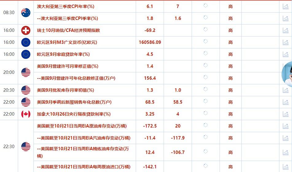 22:00 加拿大10月26日央行隔夜贷款利率(%) , 前值 3.25 , 预期值 4 , 公布值:待发布22:30 美国截至10月21日当周EIA原油库存变动(万桶) , 前值 -172.5 , 预期值 20 , 公布值:待发布22:30 美国截至10月21日当周DOE总燃料乙醇库存(万桶) , 前值 2184.4 , 预期值 -- , 公布值:待发布