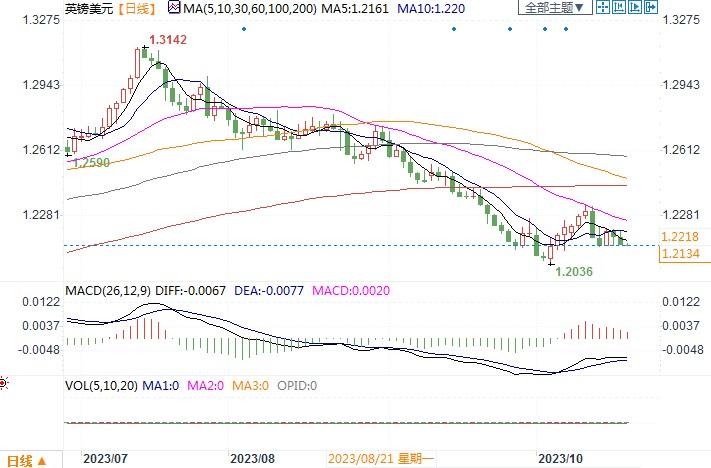 尾盘下跌0.32%,报1.2144。英国9月消费者物价通胀(CPI)意外保持在6.7%的水平,仍是所有主要发达经济体中最高的,受此影响,英镑一度上扬,但之后由升转跌。尽管英国通胀率略高于预期,但这份通胀报告中可能没有任何内容会促使英国央行在11月再次加息。根据国际货币基金组织(IMF)上周的预测,英国是七国集团(G7)发达经济体中通胀率最高的国家,但明年的经济增长速度预计也将是最慢的。而与之相对照的是,当日市场上美债收益率又创历史新高,这继续使美元保持着强势风头。技术图形上,无论小时还是日线图上,汇价都落于布林带中轨线之下,下行倾向仍较明显。下方须密切留意1.2100的支撑,若下穿,下方将会再度考验1.20大关的支撑。上方未有突破近期的震荡区域的强阻力1.23,或才有望看到扭转颓势的希望。