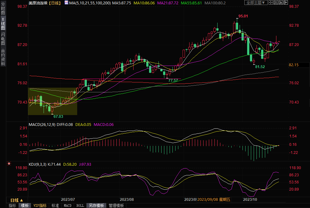 美国原油库存紧缺,支撑美油期货走势。据美国能源信息署(EIA)最新消息,原油库存紧缺:上周美国石油产品出口量下降至2022年10月以来的最低水平;至10月13日当周除却战略储备的商业原油进口量为594.2万桶/日,较前一周减少38.7万桶/日,为2023年7月7日当周以来最低;至10月13日当周EIA精炼油库存降幅录得2023年5月5日当周以来最大降幅;至10月13日当周原油出口量增加223.4万桶/日至530.1万桶/日,为2023年6月23日当周以来最高;至10月13日当周EIA俄克拉荷马州库欣原油库存降至2014年10月以来的最低水平;至10月13日当周EIA战略石油储备库存维持在3.513亿桶不变;10月13日当周美国国内原油产量维持在1320.0万桶/日不变;美国原油产品四周平均供应量为2021.5万桶/日,较去年同期减少0.95%。