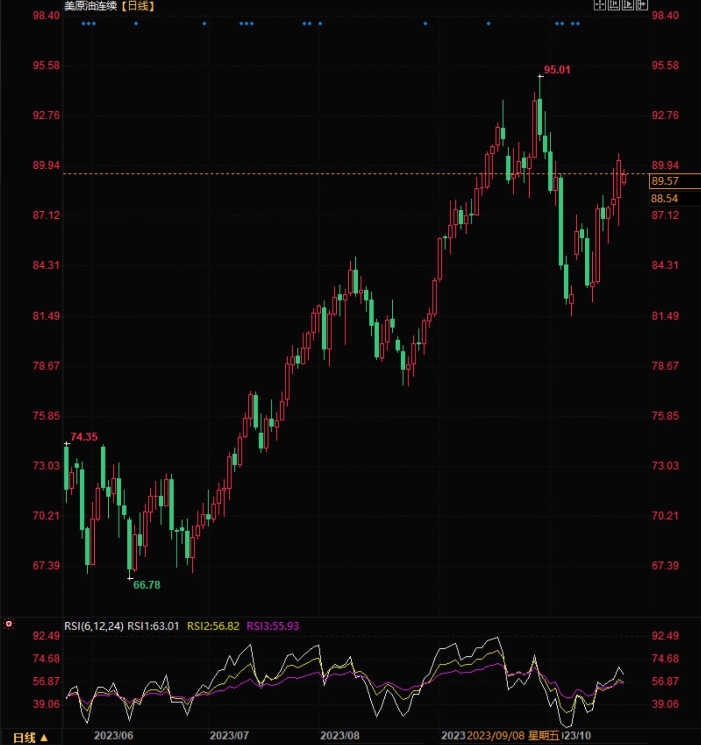 跌破 50 日均线可能会导致回调至近期盘整区间的底部,而 200 日均线将强化这一趋势。另一方面,突破周三形成的流星形顶部,开启了市场迈向 90 美元水平的可能性。90 美元的水平会有一定的利息,但如果我们能突破这个水平,我们可以很快赚到 5 美元左右。
